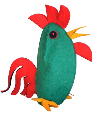 Magyarországon előállított, többnyire magyar alapanyagokból, kézi munkával készített, magas minőségű termék, mely kimondottan pedagógia módszertani szempontok alapján lett kialakítva. Felnőtt kézre méretezve, így kiválóan alkalmas az anyanyelvi vagy zenés foglalkozások kiegészítésére. A kakas kesztyűbáb 25-30 cm nagyságú, egykezes, filcből készült báb. Teste zöld, farktollai lila és fekete, taraja és szakálla élénk piros filcből lett elkészítve. Hosszú filc csőre és lábai narancssárgák. Vidám kinézetével bármilyen foglalkozás színfoltja lehet.