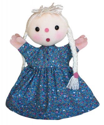 Antoni Rozália iparművész által tervezett zsűrizett iparművészeti alkotás. Magyarországon előállított, többnyire magyar alapanyagokból, kézi munkával készített, magas minőségű termék, mely kimondottan pedagógia módszertani szempontok alapján lett kialakítva. Felnőtt kézre méretezve, így kiválóan alkalmas az anyanyelvi vagy zenés foglalkozások színesítésére, kiegészítésére. A kislány kesztyűbáb 25-30 cm nagyságú, három ujjas, puha textilanyagból készült báb. Blúza rózsaszín vászon, három gyöngy gombbal. Szoknyája aprómintás vászon. Kezei és arca rózsaszín, plüss anyagú arcát rózsás pír teszi bájos megjelenésűvé. Haja két copfba font, citromsárga színű fonalból készült, a copfok végén piros filc virággal. Szemei fekete gombszemek, orra és szája rózsaszín.