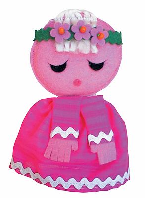 A kislány ujjbáb arca és kezei világosrózsaszínek, ruhája sötétrózsaszín. Haja fehér színű fonal, virágos hajpánt dísszel. Az ujjbábok mérete általánosságban kb. 12,5 cm.