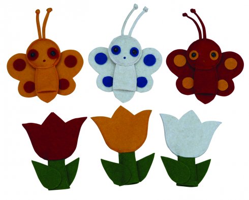 A három pillangó ujjbábkészlet tartalma 6 db ujjbáb: piros, sárga, fehér lepkék, illetve piros, sárga, fehér virágok. Az ujjbábok mérete általánosságban kb. 12,5 cm.