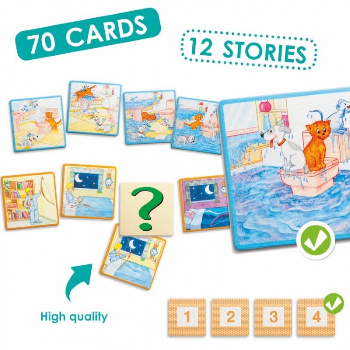 A játék 70 db képkártyát tartalmaz, amelyek összesen 12 db humoros és vicces történetet mutatnak be. A képeket sorrendbe téve a gyermek elmesélheti vagy körülírhatja a képeket. Lehetőség van arra is, hogy egy-egy kártyát kihagyjunk a képsorból, ezáltal a gyermek saját maga alakíthatja a történetet.