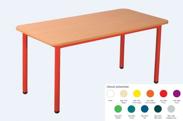 Az óvodák és bölcsődék számára gyártott fémvázas Emese óvodai asztal (bölcsődei asztal) elektrosztatikus porszórással festett 4 cm átmérőjű acélcső vázszerkezettel, 1,8 cm vastag laminált asztallappal, ABS élzárással, lábak végén műanyag végzáró dugóval készül.