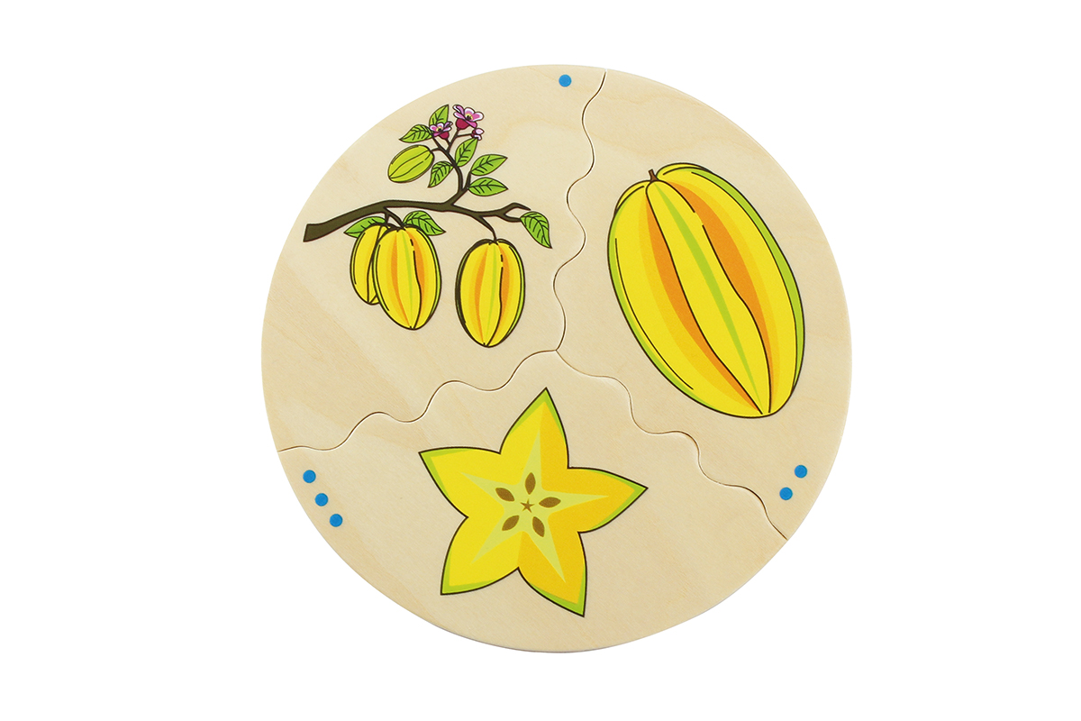 A fából készült, 3 körcikkre osztott kirakón egy adott gyümölcs egész képe, a félbevágott képe és a fán/bokron lógó képe látható.