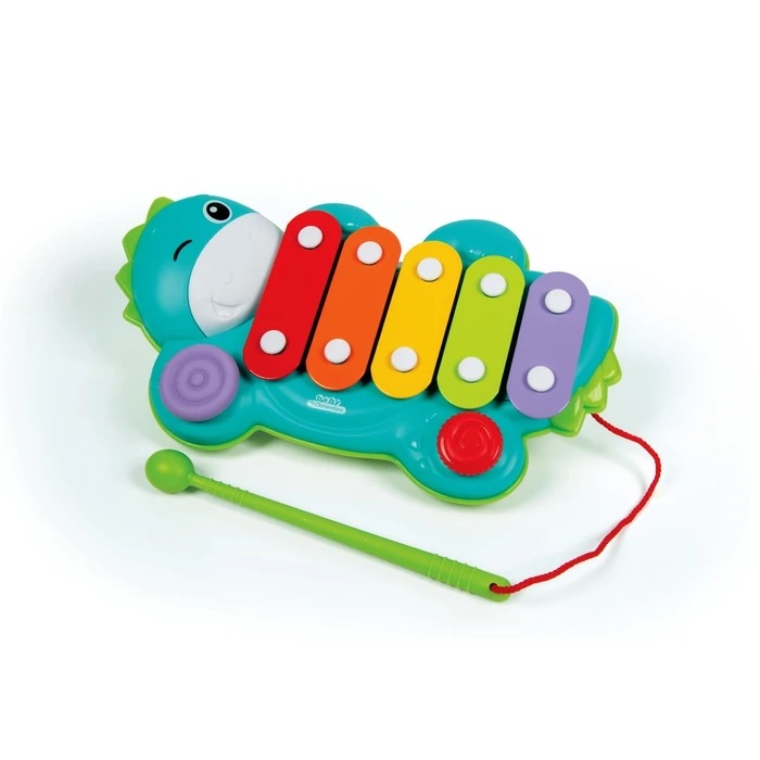 Vidám színekből összeállított dínós xilofon a legkisebbeknek. Az ütő egy zsinórral van rögzítve a xilofonhoz, a véletlen elveszítés elkerülése érdekében. A kacsintós dínón, 5 hangból álló hangsoron lehet kísérni a gyermekdalokat.