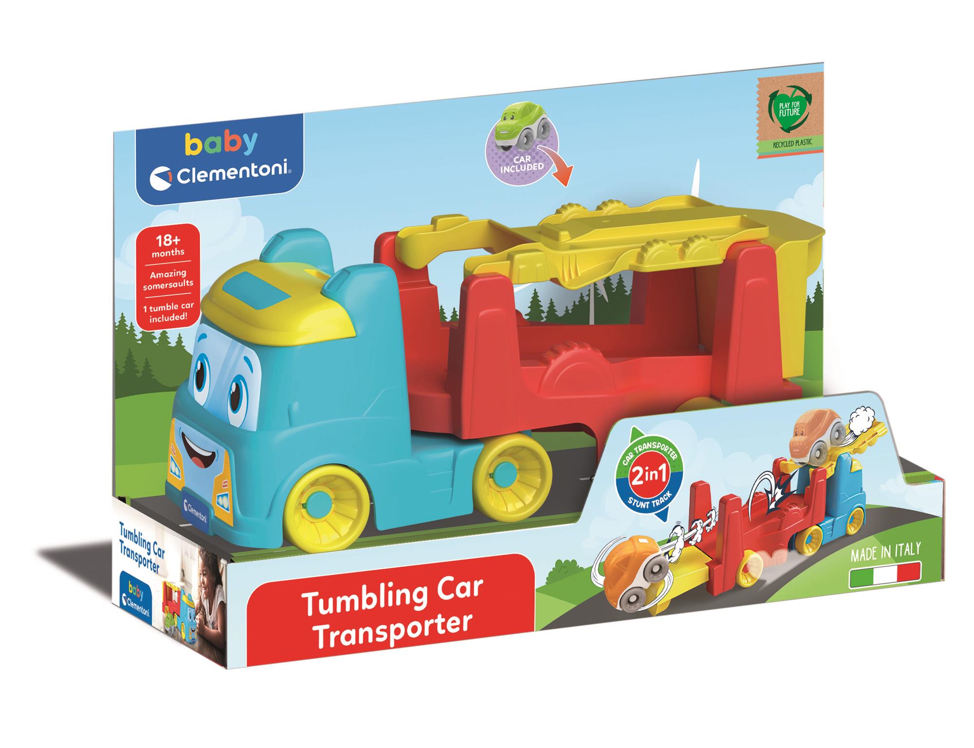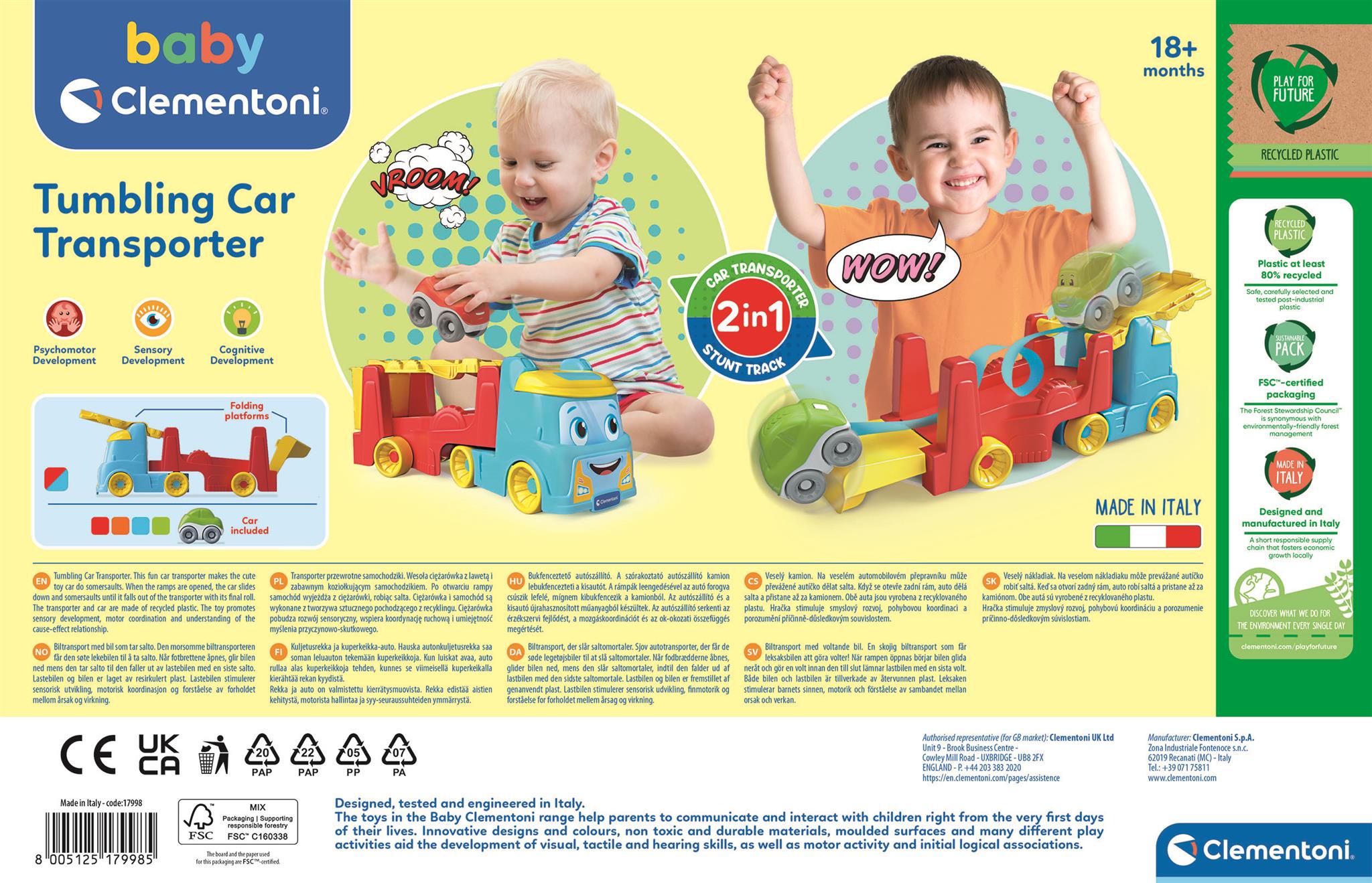 A Clementoni újrahasznosított műanyagból készült autós készlete igazán sok vicces pillanatot rejt, ugyanis a szetthez tartozó kicsi autó úgy száguld le a kamion rámpájáról, hogy közben egy hatalmasat szaltózik.