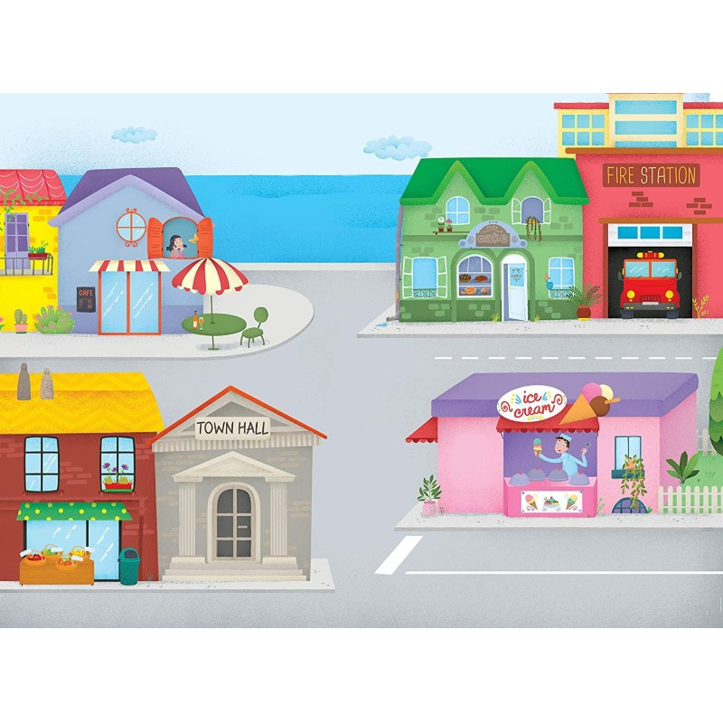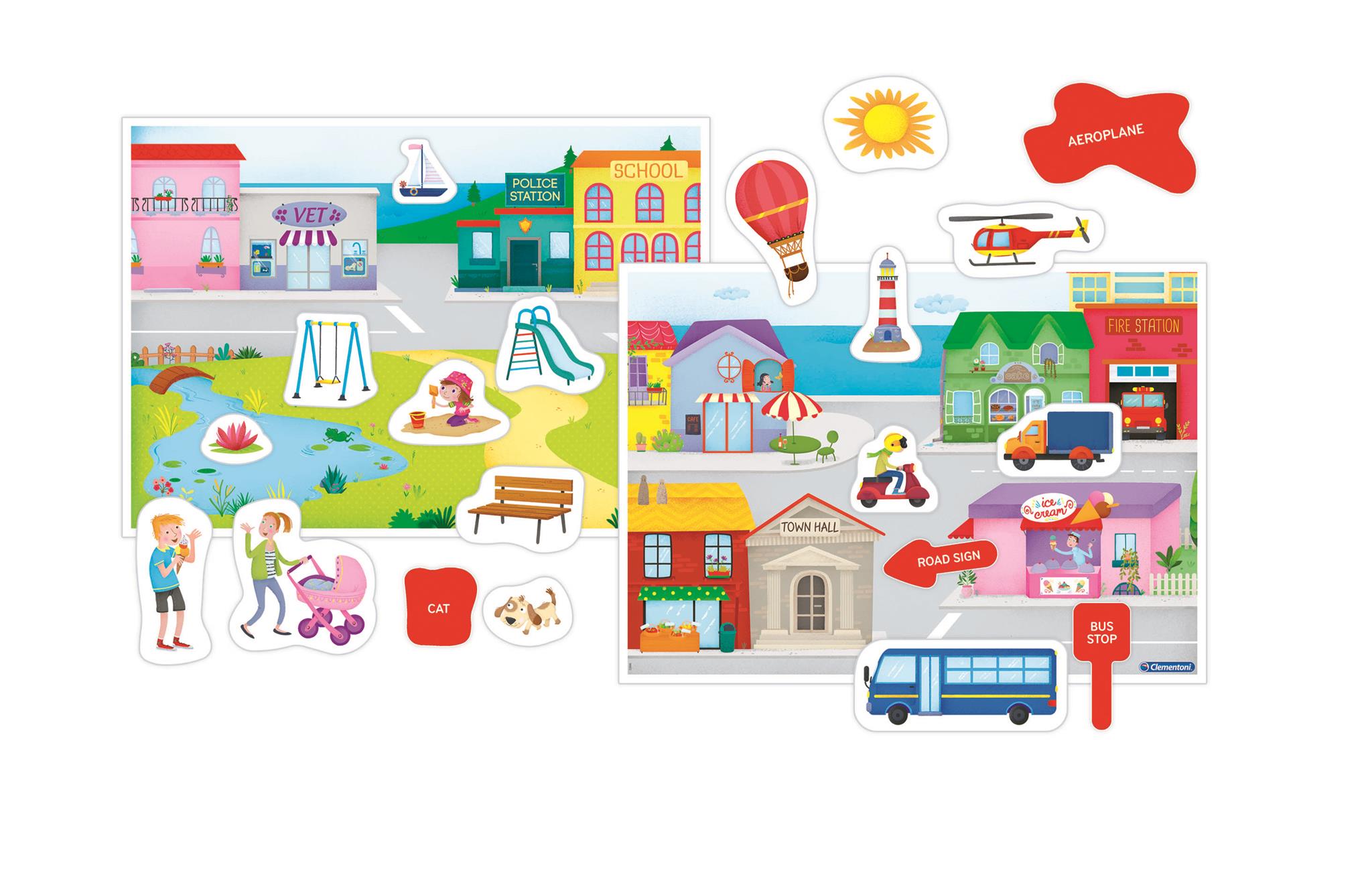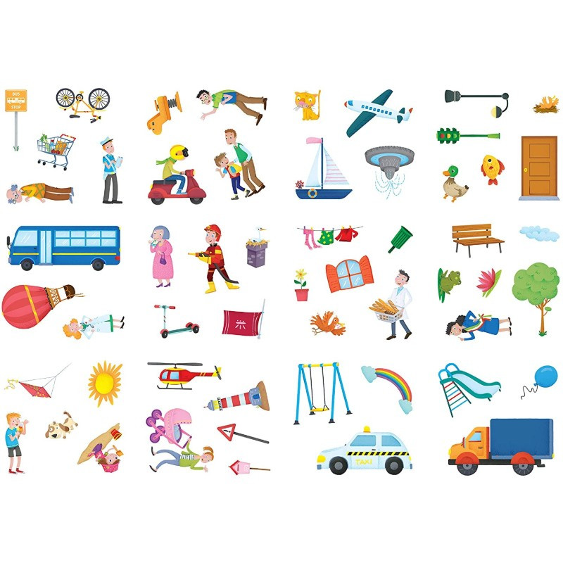 A doboz 1 db posztert 2 életképpel, 55 db képes elemet angol szavakkal és egy játékötleteket tartalmazó útmutatót tartalmaz.