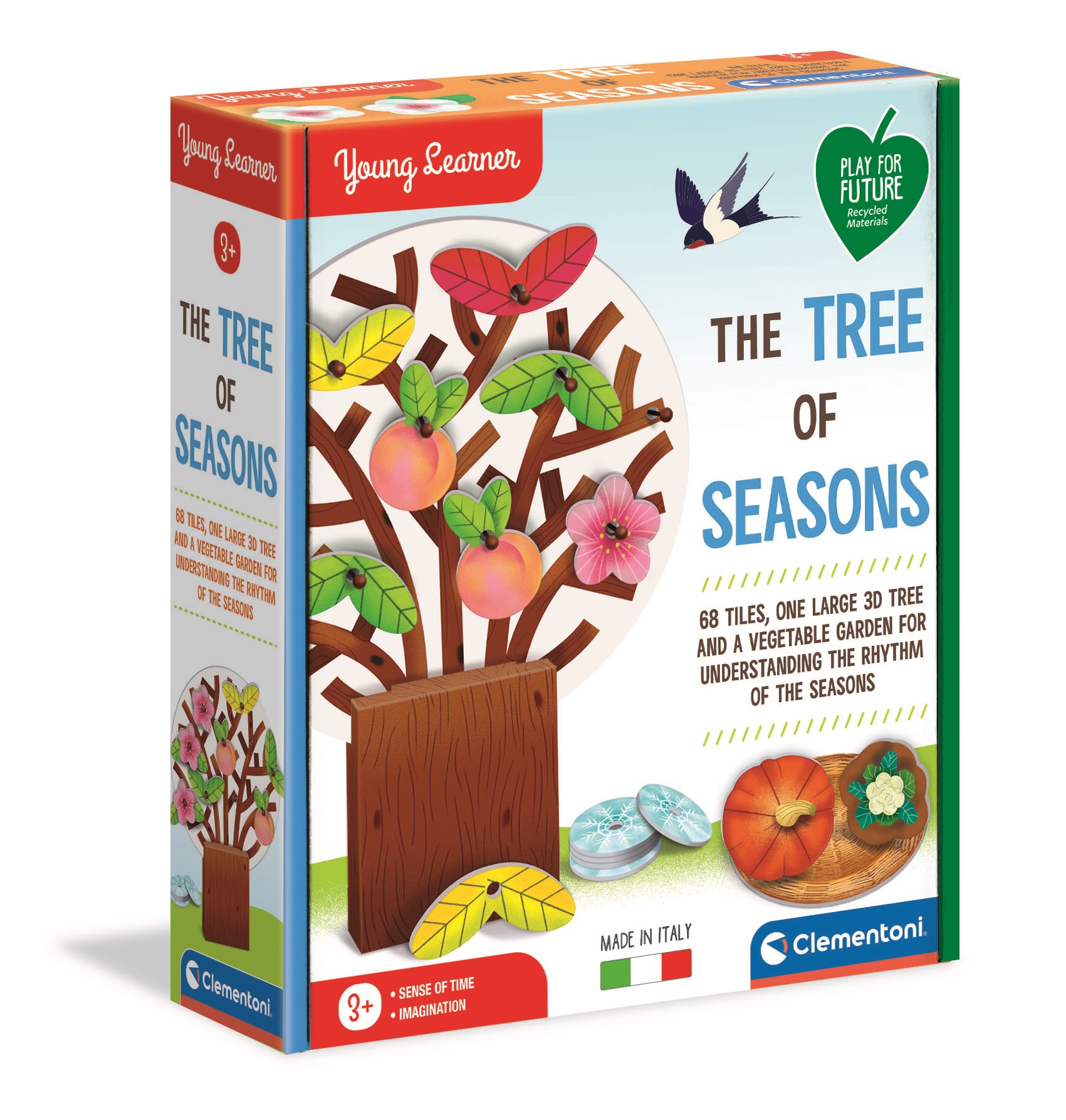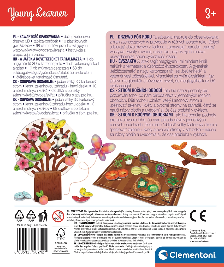 A dobozban található nagy kartonfát a gyerekek felöltöztethetik az adott évszaknak megfelelően: hópelyhekkel, levelekkel, virágokkal és őszibarackkal, attól az évszaktól függően, amelyiket szeretnék bemutatni.