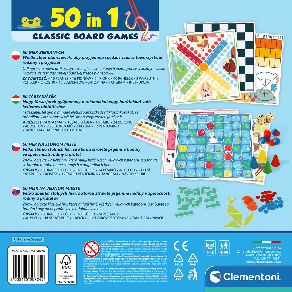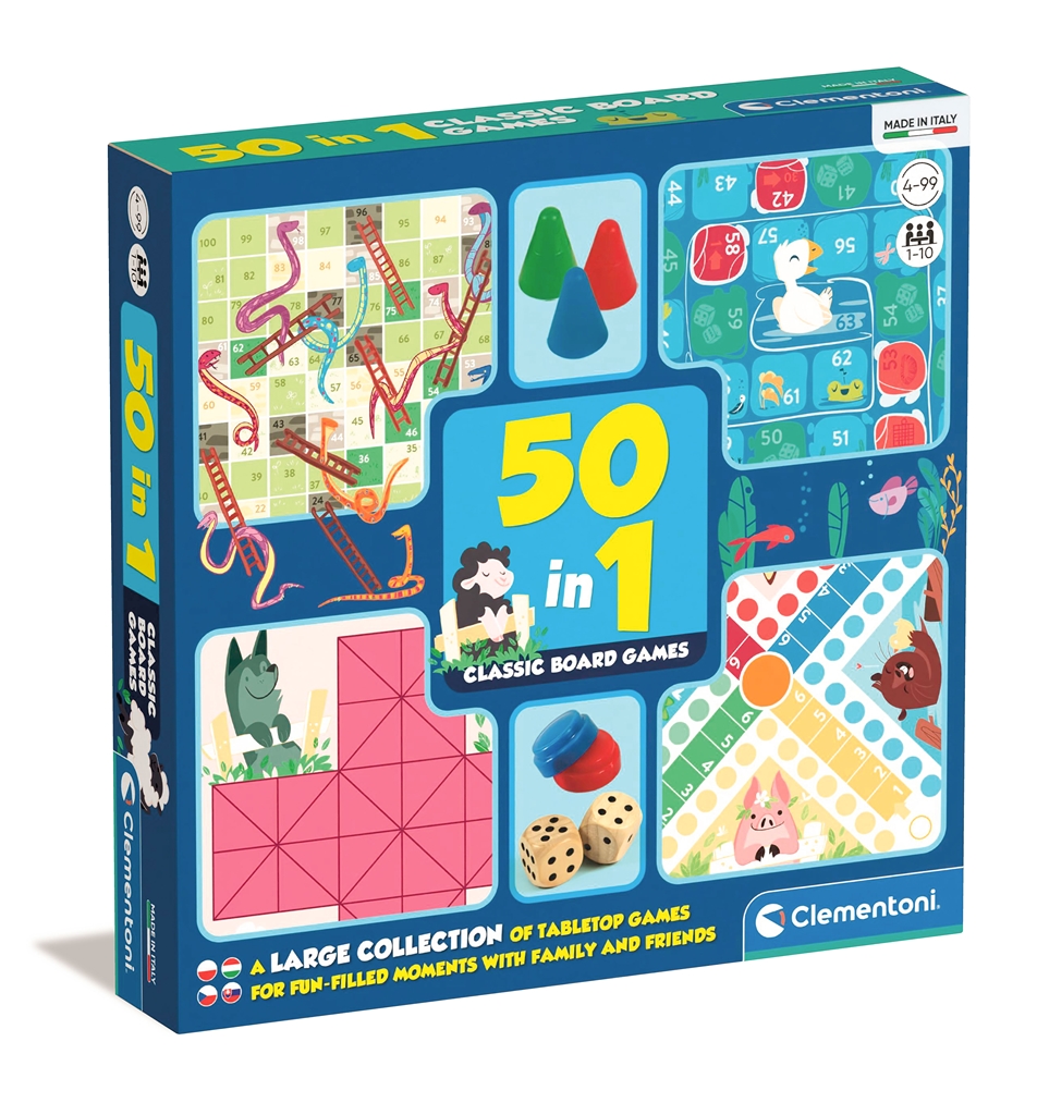 A Clementoni 50in1 játékgyűjteménye egy igazán sokszínű és változatos összeállítás, mely tartalmazza a legtöbb klasszikus és egyedi társasjátékot is.