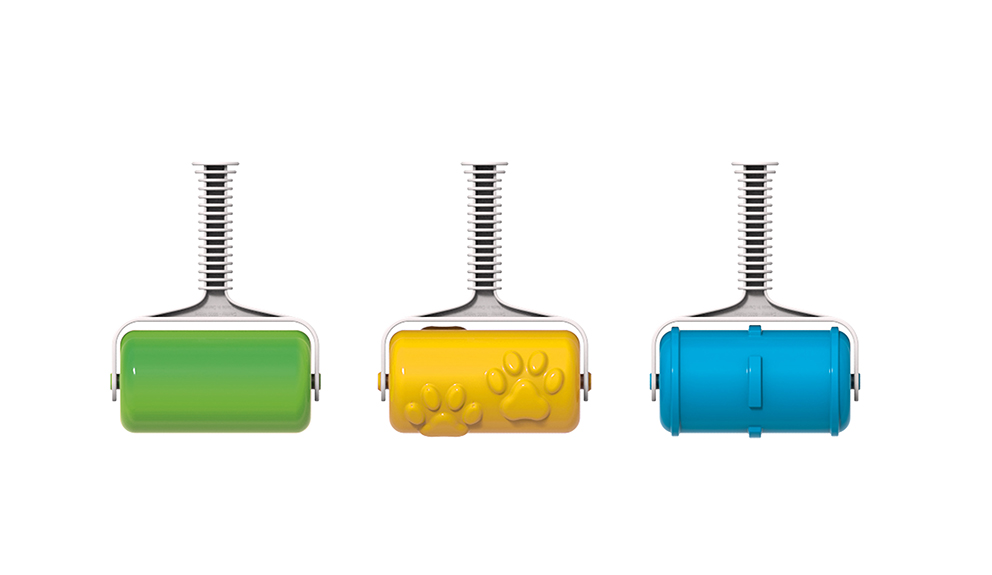 A készlet tartalma: 1 db sima felületű, zöld színű henger, 1 db mancsmintás, sárga színű henger, 1 db úttest mintájú, kék színű henger.