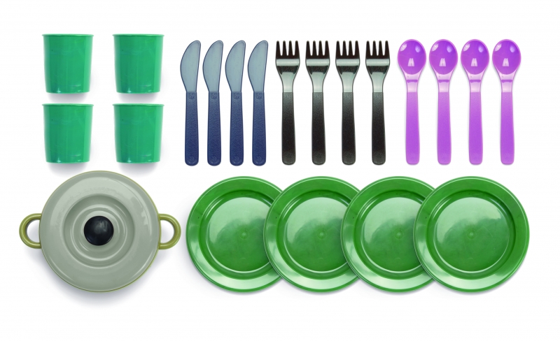 A készlet tartalma: 22 db-os készlet. 4db tányér, 4 db pohár, 4 db kés, 4 db villa, 4 db kanál, 1 db lábas, 1 db fedő. A készlet 22 db-os