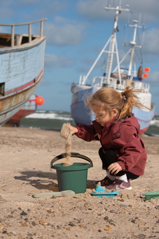 A minőségi homokozó készlet vödröt, szitát, lapátot, gereblyét, homokozó formát és még egy kishajót is tartalmaz.