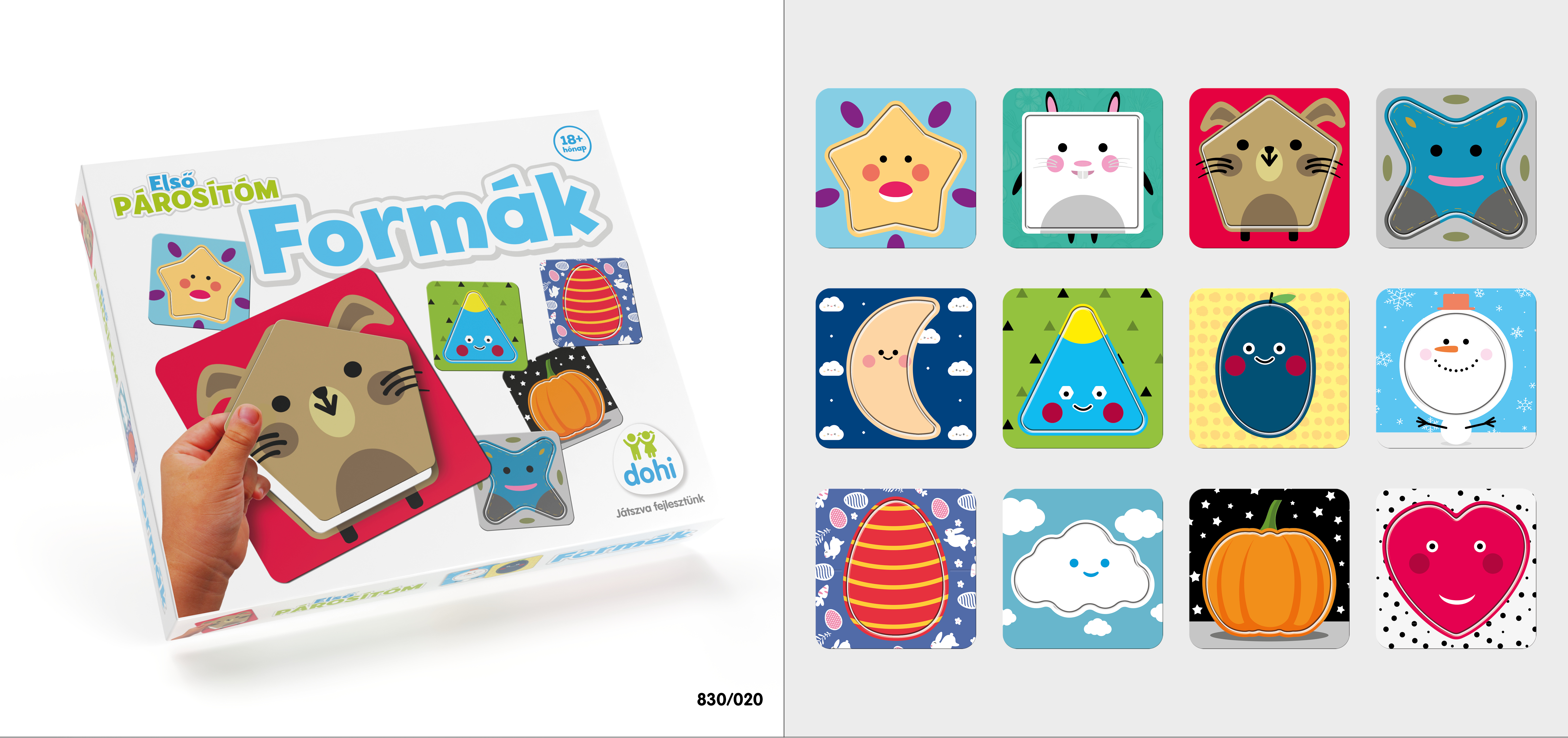 A dobozban 12 db kis kártyát találsz, amin különböző formák láthatók, pl. hold, hóember, felhő, szív stb. Jól jegyezd meg, hogy melyik kártyában, melyik forma látható.
