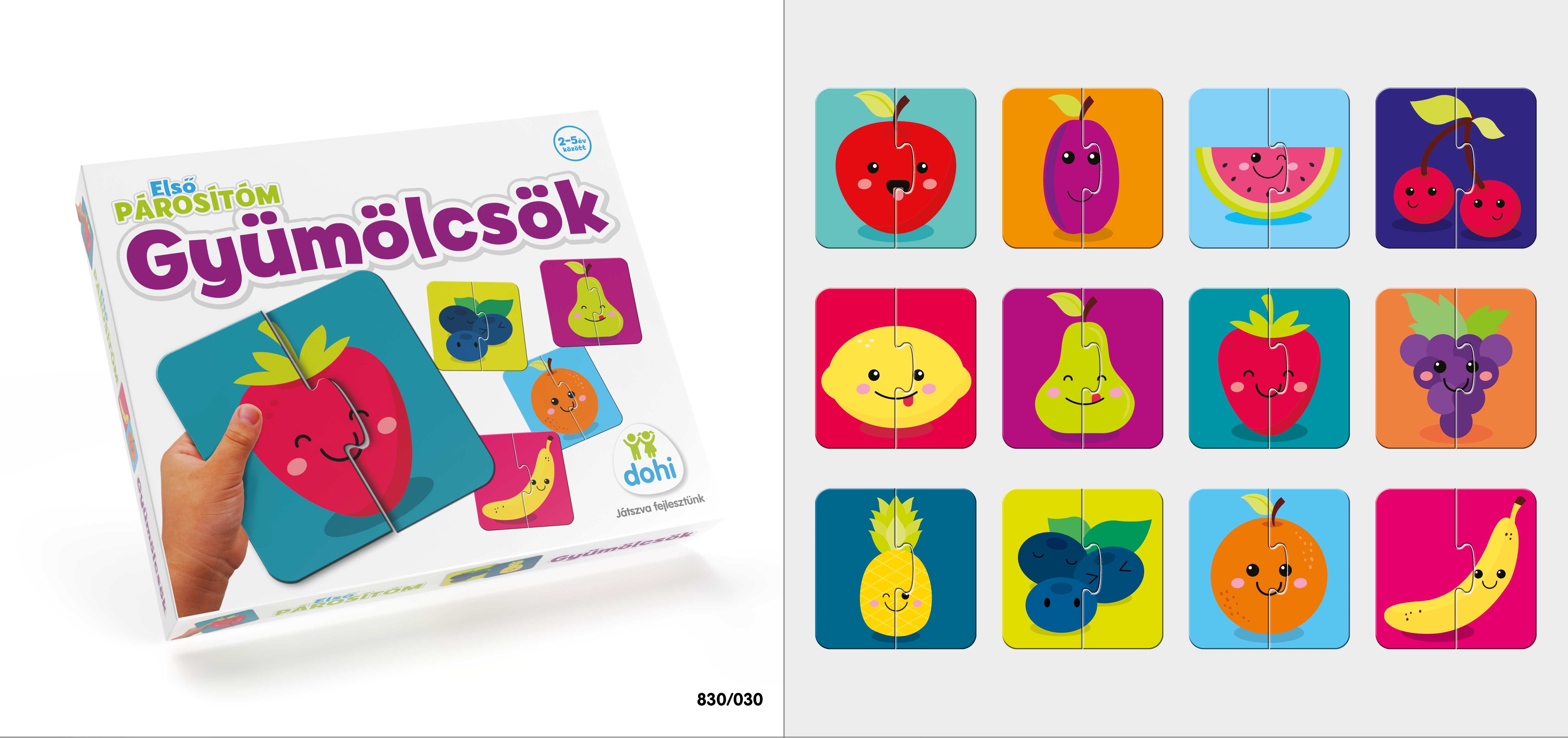 A dobozban 24 db fél kártyát találsz, amin különböző gyümölcsök szerepelnek. Jól jegyezd meg, hogy melyik kártyának melyik a másik fele.