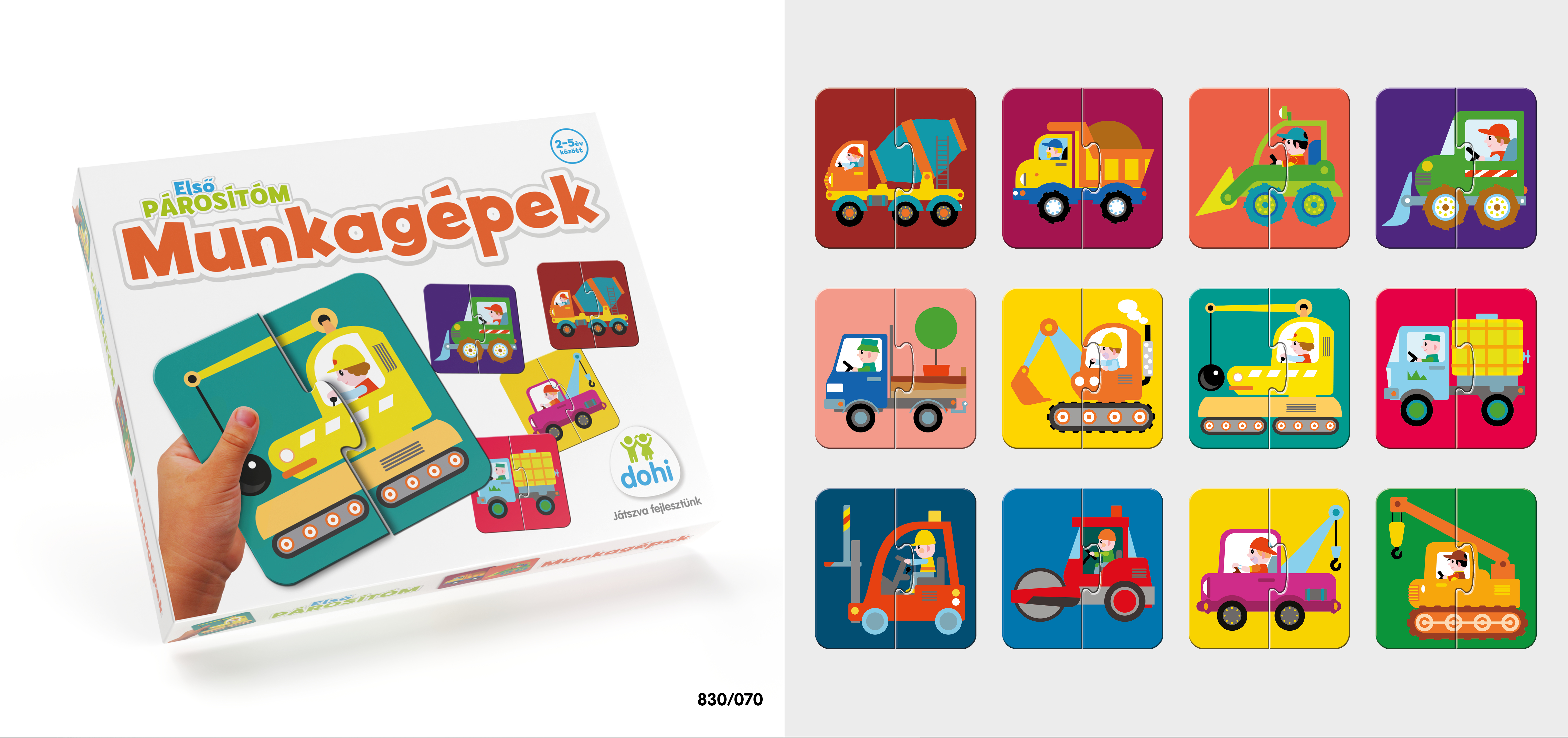 A dobozban 24 db fél kártyát találsz, amin különböző munkagépek szerepelnek. Jól jegyezd meg, hogy melyik kártyának melyik a másik fele.