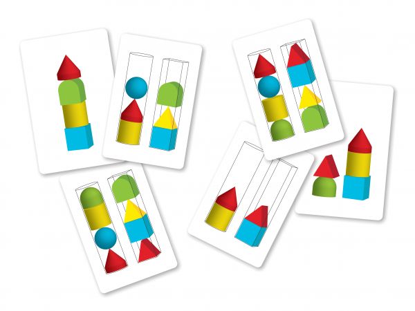 A doboz feladat kártyákat tartalmaz, amin különböző helyzetekben láthatóak a formák.