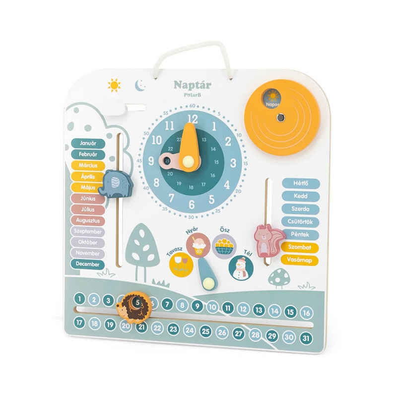 A magasminőségű fából készült falinaptár kitűnő oktatási eszköz, mellyel a napok, a hónapok, az időjárás, az évszakok és az óra is megtanítható.