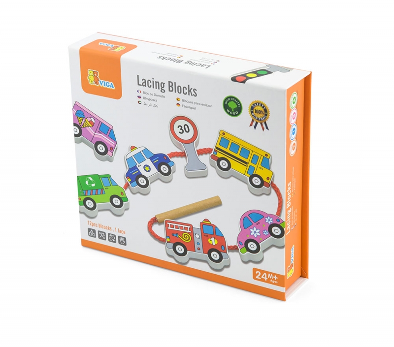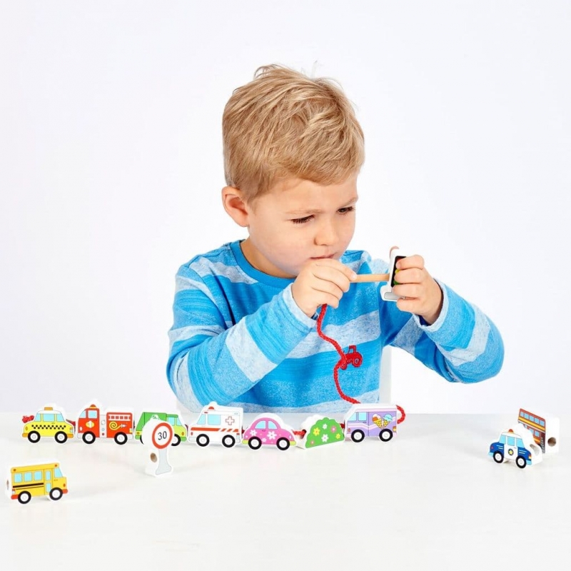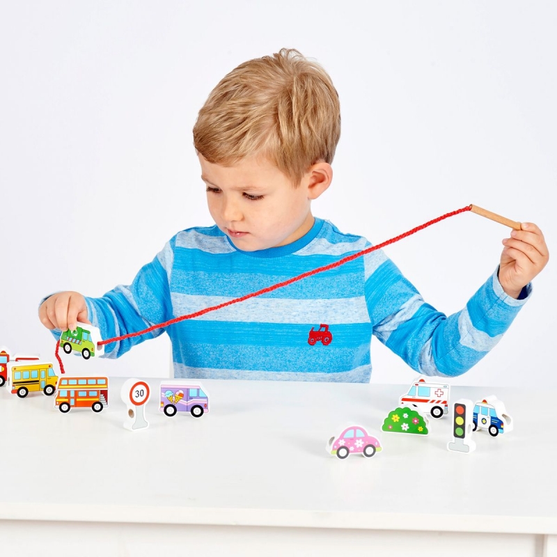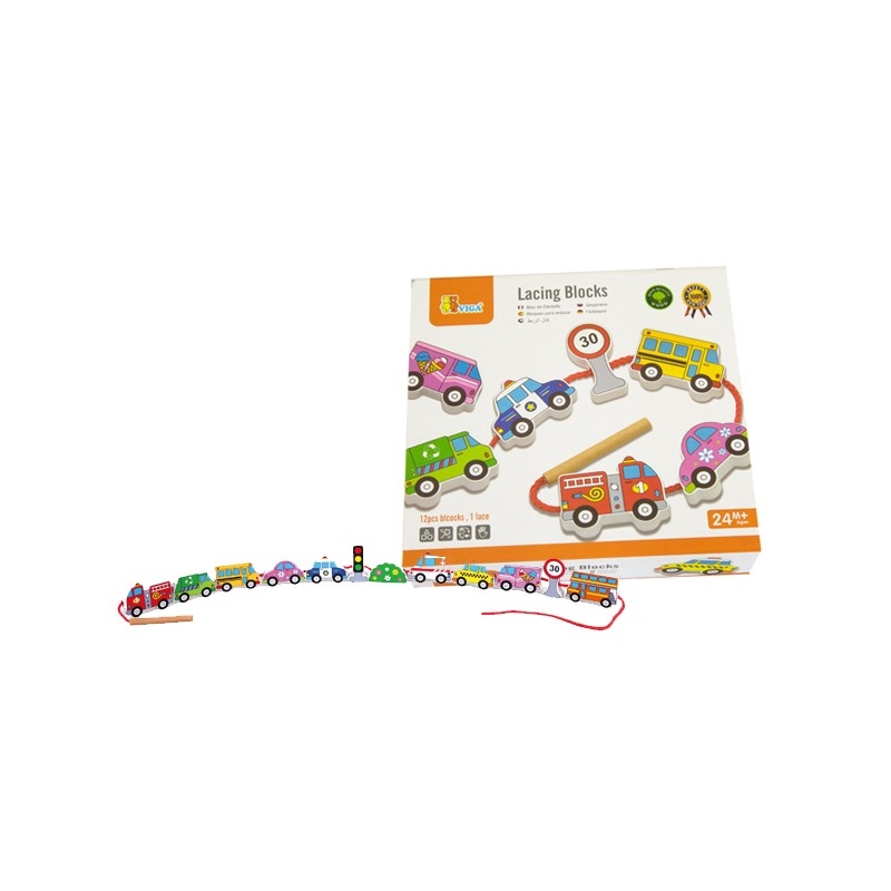 Fából készült fűzhető játék járműves formákkal. A játék fejleszti a finommotorikát, a szem-kéz koordinációt és a kreativitást.