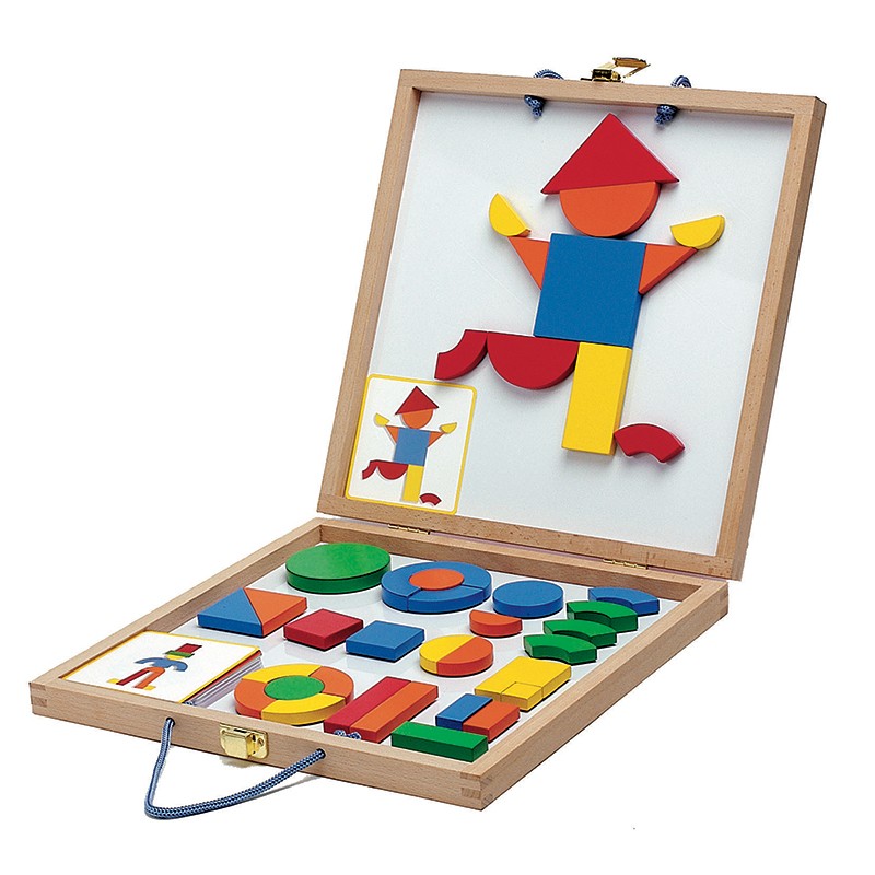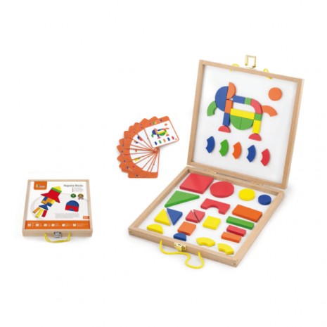 A mágneses geometriai formák segítségével különböző képeket rakhatunk ki. Fejleszti a gyerekek finommotorikáját, szem-kéz koordinációját, kreativitását, szín- és formafelismerését.