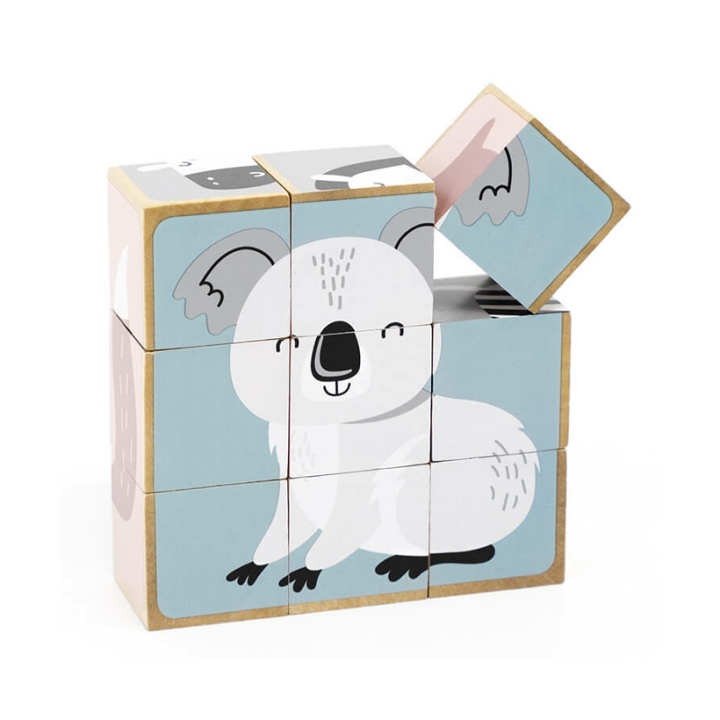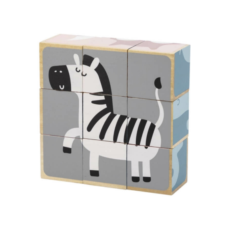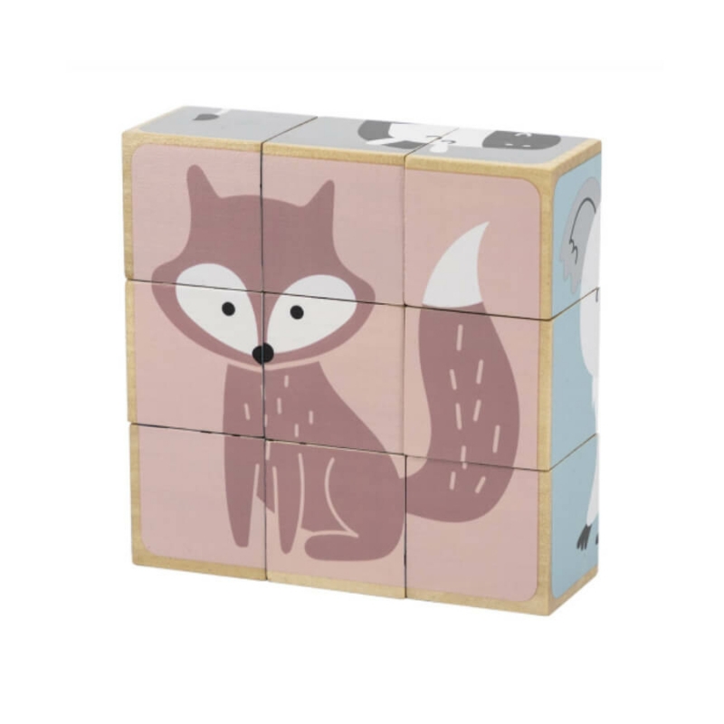 Az állatos mesekockákból 6 db kedves kis állatka, pasztell árnyalatokból álló képe rakható ki. A képek közt megtalálható a róka, a zebra, a koala, a jegesmedve, a süni és az elefánt.