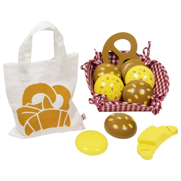 A szettben egy bevásárlószatyor, kendővel fedett kosár és fából készült péksütemények találhatóak. Magos és sima zsömlék, illetve kifli és perec is a készlet részét képzik.