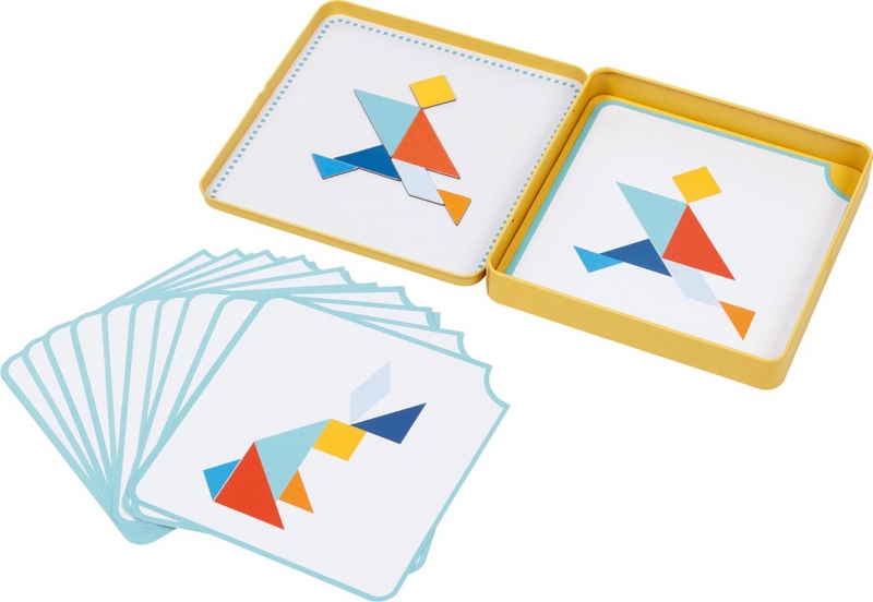 Kis fém dobozának belső felére tapadnak a mágneses tangram elemek, melyekből a különböző nehézségi szintű feladatkártyák segítségével figurák és formák rakhatóak ki.