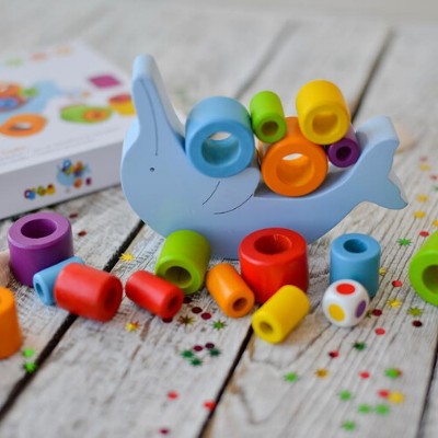Dobj a dobókockával, majd rakd a delfinre a színes gyűrűt anélkül, hogy a torony leborulna.