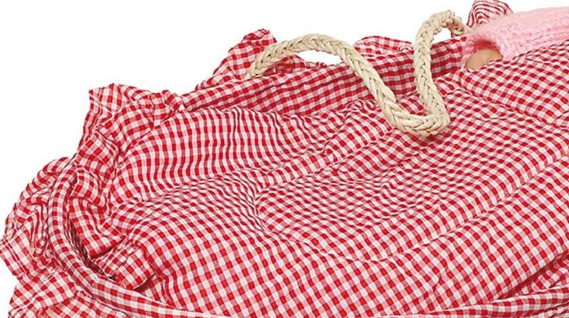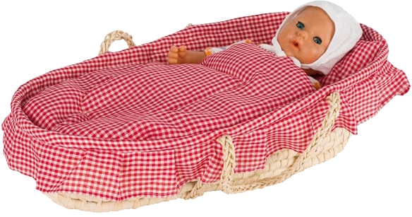 A termék a babát nem, de a matracot, párnát, paplant tartalmazza! Gyönyörű, fonott mózeskosár, piros-fehér kockás matraccal, párnával és paplannal. 52 centiméteres babákhoz használható.