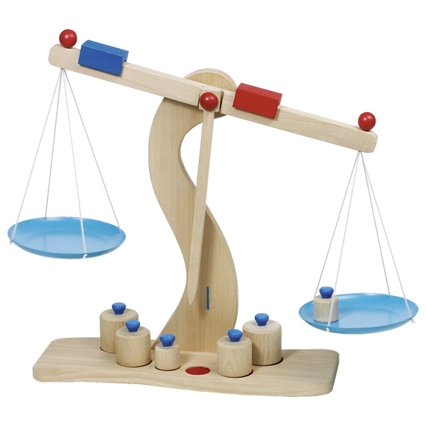 A termék mérete: 30x10x31 cm, tartalma: 1 db mérleg fából, 2 db serpenyő, 6 db súly,