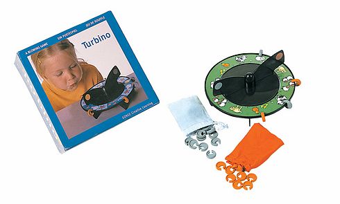 Turbina társasjáték a helyes légzéstechnika elsajátításához. A játéknál egy propellert kell pörgetni a kifújt levegővel. A fújás erőssége és iránya befolyásolja meddig pörög a propeller, ez pedig lényeges a játék kimenetele szempontjából. Az alaptábla színe zöld, kis állatfigurákkal. A propeller fekete, két karjának egyik végén szürke, másik végén narancs színű jelölést láthatunk. A készlet tartalma: - 1 db alaptábla - 10 db szürke színű, műanyag jelölőkarika - 10 db narancs színű, műanyag jelölőkarika - 2 db textil titokzsák (szürke és narancssárga színekben).