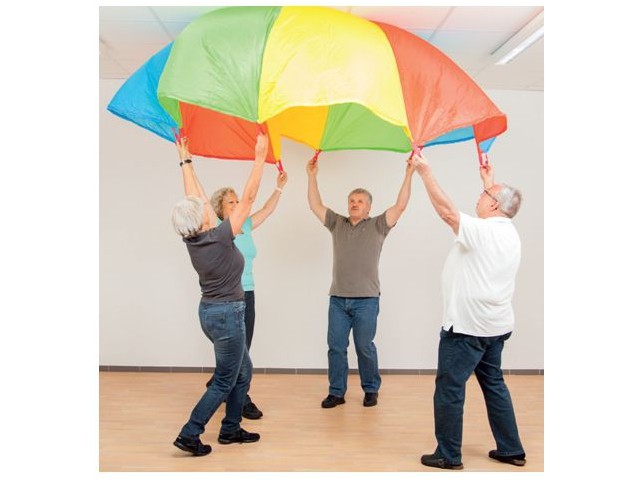 A színes, könnyű, tűzálló poliészterből készült, 12 db nagyon erős fogantyúval az ejtőernyő sokféle játékot és tevékenységet inspirál.