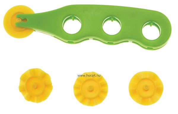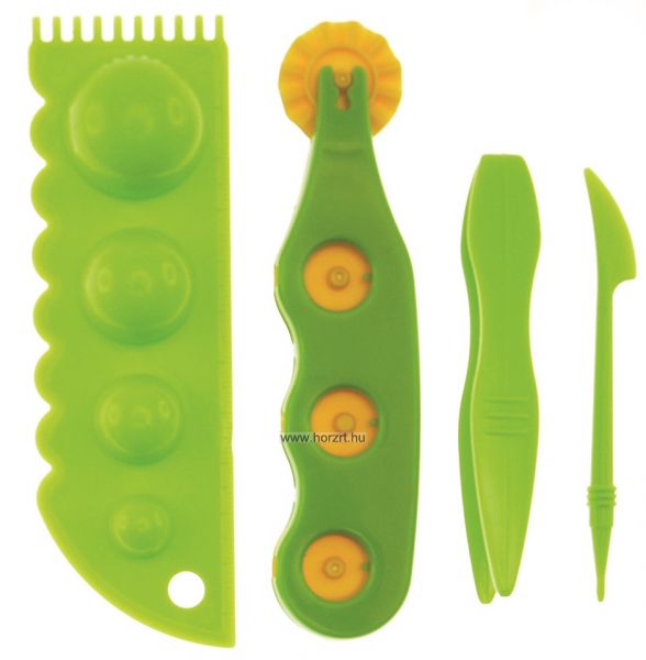 A Gowi 7 darabos gyurmázó szettjében megtalálható egy csipesz, egy kis vágókés és lyukasztó, egy 4 fejet tartalmazó görgős vágó, illetve egy komplex lyukasztó/csíkozó eszköz. A készlet erős műanyag anyagból készült, így hosszútávon lehet minden gyurmázás kiegészítője. Az elemeknek élénk zöld színe van, a 4 különböző fej pedig citromsárga. A fejek között megtalálható egy sima korong és további 3 hullámos vágó is, melyekkel más és más hullámok vághatóak ki. A fejeket a vágóeszköz markolatába lehet rögzíteni.
