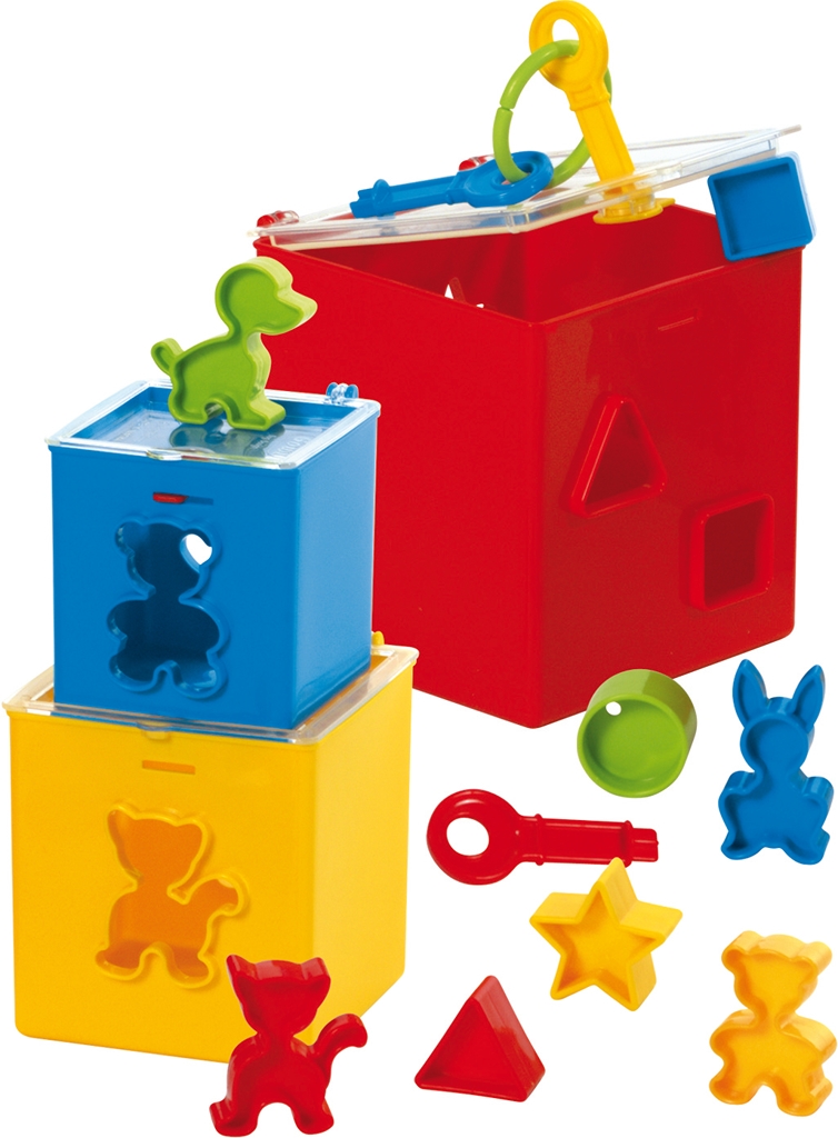 Rendezhetik a különböző formákat a három dobozba, majd egymásba rakják a dobozokat. Tökéletes apró kincsek tárolásához, valamint a koordináció és a megfigyelés fejlesztésére.