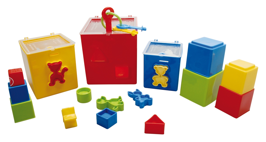 Ez a készlet kiválóan fejleszti a finommotorikát. A három nagyobb kocka egyben egy tárolódoboz is, amelyekbe a különböző színű-, és formájú részeket lehet pakolni.
