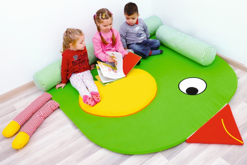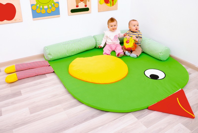 A puhasarok - madárka formában egy puha szivacs szőnyeg, egyben henger alakú párnákkal, amik megtámasztják a legkisebbeket is, így biztosnággal játszhatnak. A szőnyeg formája lekerekített sarkú négyzet. Alakjának közönhetően a szoba sarkához pontosan illeszkedik. A madárka teste zöld színű, szárnya citromsárga, hegyes csőre piros. Hosszú hengeres lábai piros-fehér csíkosak, sárga végekkel. A madárka fején egy nagy szem látható, csőrén mosolygós szája van. Tekintete kedves és vidám megjelenést kölcsönöz neki. A henger alakú párnák színe zöld, fehér csíkokkal A szőnyeg belső összetétele habszivacs, külső huzata pamutszövet. Mérete: 195x173 cm, vastagsága: 2 cm. A henger vastagsága: 20 cm.