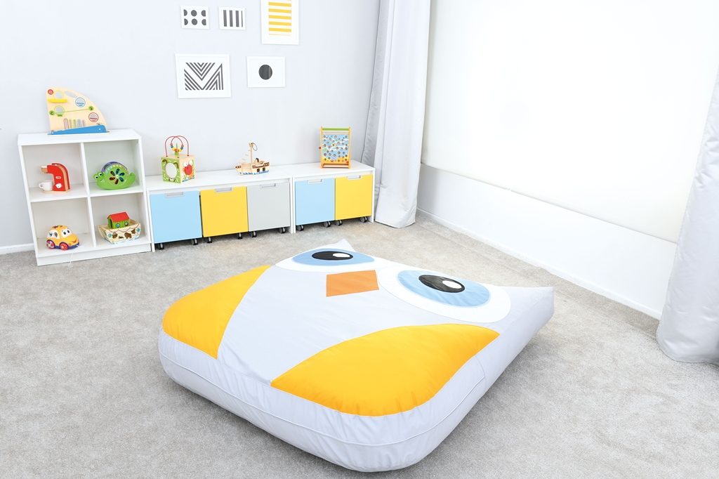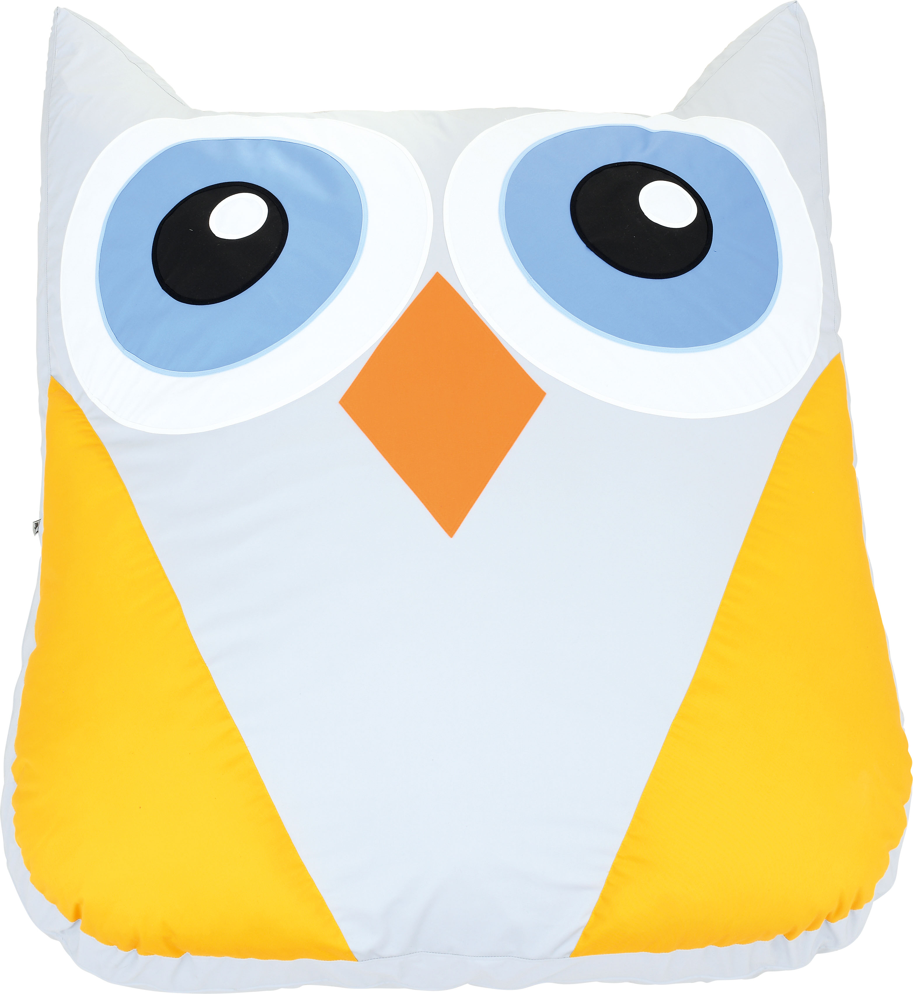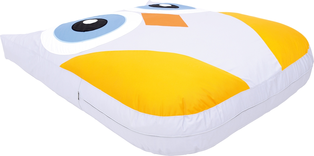 Az óriás bagoly mintájú és alakú padlópárna pasztell színekkel lett megalkotva. A bagoly teste világos szürke, szárnyai citromsárgák, csőre narancssárga, nagy szemei kékek, fehér szegéllyel. A párna formája lekerekített négyszög, füleinél háromszög alakú megnyújtással. A párna töltete habszivacs, huzata pamutszövet. A huzat lehúzható és mosható. Méretének köszönhetően több gyermek is biztonságosan és kényelmesen elfér rajta. Mérete: 147x180x20 cm.