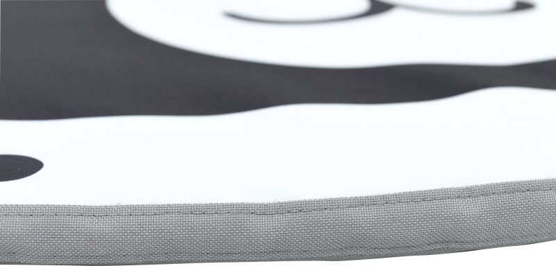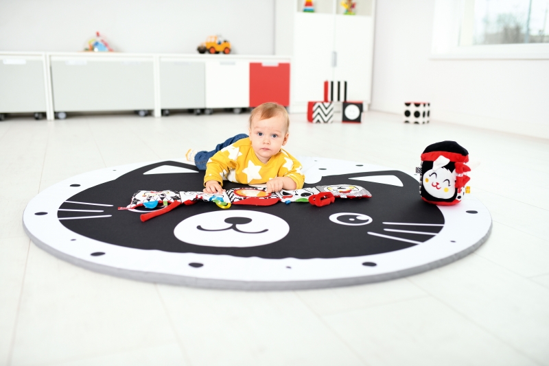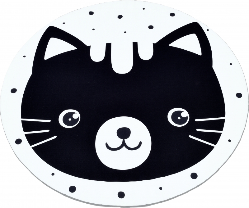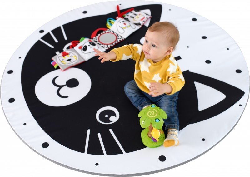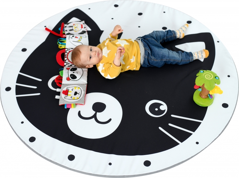 A kis kör alakú matrac egy mosolygós cica képét mutatja, fekete és fehér színekből kialakítva. A kontrasztos színek vonzzák a tekintetet, a legkisebbek számára pedig fejlesztő hatással van a látásukra.