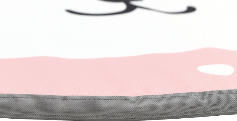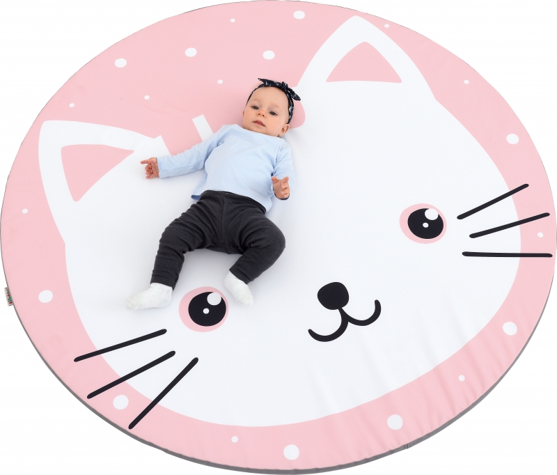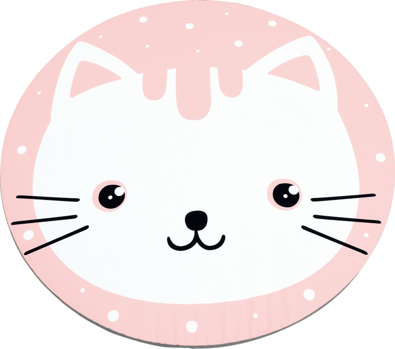 A kis kör alakú matrac egy mosolygós cica képét mutatja, rózsaszín és fehér színekből kialakítva.