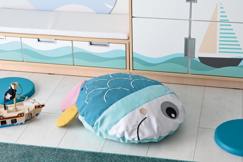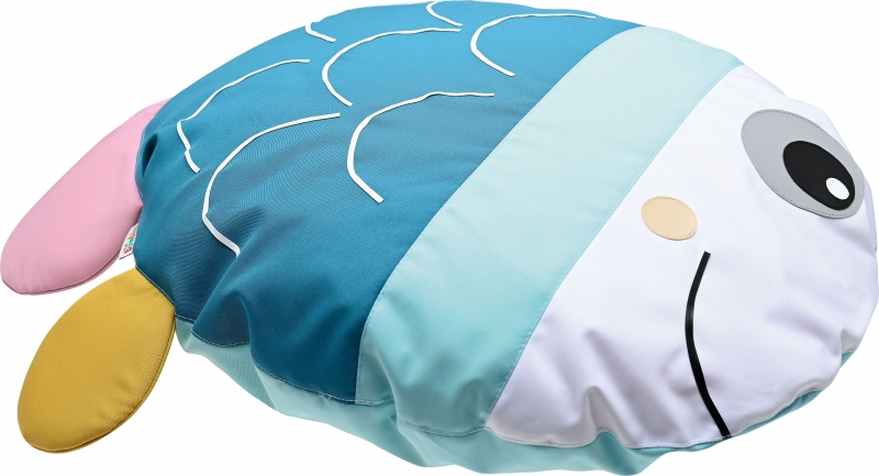 A halacska formájú padlópárna többféle élénk színből áll össze. Belső töltete habszivacs, külső huzata textil. A huzat lehúzható és mosható.