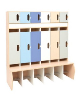 Bambi gyereköltözőszekrény, 6 személyes. A szekrény mérete: 126x50x134 cm. Ülésmagasság: 33 cm. Ülés mélység: 23 cm. Kis fakk mérete: 19x22,5x19 cm. Nagy fakk mérete: 69,5x22,5x19 cm. Cipőtartó polc magassága: 20 cm. Az öltöző laminált bútorlapból készül, mely fehér színű. A cipőtároló rekeszben fém rudakra helyezhetőek a kiscipők. A szekrény 3 részre van osztva, felül a kis fakkok, középen a nagy fakk, alul pedig a cipőtartó polc található. A fém kampókat a termék tartalmazza. A öltözőszekrényhez különböző színekben vásárolható ajtószett, ezeket a csomag nem tartalmazza.