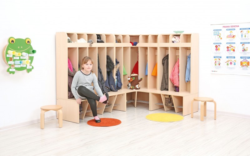 A szivárvány öltözőszekrény termékcsaládhoz tartozó 5 személyes elem magasabb verziója kimondottan intézmények számára, az óvodás korosztály életkori sajátosságait figyelembe véve lett megtervezve.