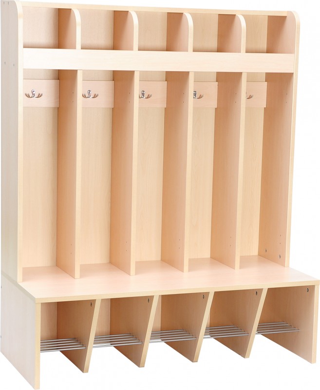 Az ülőfelület alatt rekeszenként külön-külön cipőtároló rácsos polc található. A rekeszeken belül 1-1 fém akasztó kapott helyet, a szekrény felső részén pedig kis polcok. A polcok szélei magasítottak, így biztonságosan tárolható rajtuk bármilyen kisebb tárgy. Az öltözőszekrény juhar színű laminált bútorlapból készült, melynek köszönhetően tartóssá és könnyen tisztíthatóvá válik. Rekeszek mélysége: 25 cm. A termék mérete: 108,5x50x131 cm. Az öltözőhöz külön vásárolhatóak színes ajtók többféle színvariációban.