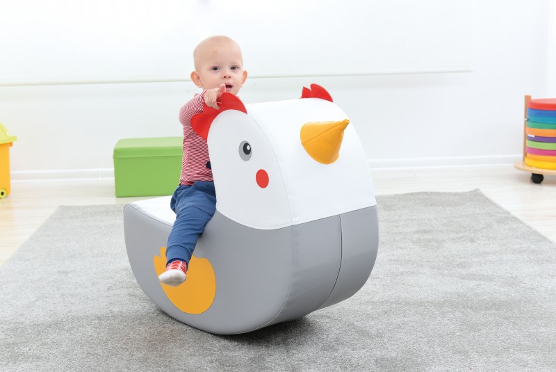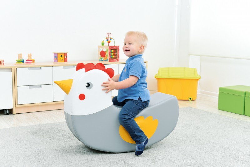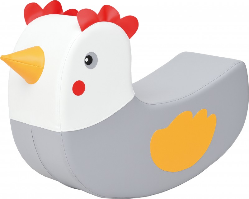 A ringató csibe egy puha műbőrrel bevont, habszivacsból készült billegő puff. Ívelt alsó része adja a játék billegő mozgását. A csibe teste világosszürke, feje fehér, kis szárnya citromsárga, az oldalán nem emelkedik ki a síkból. A csibe arca játékos, nagy szemei és citromsárga kiálló csőre van, piros kis arcpírral. A kiálló piros taraja akár kapaszkodóként is használhatóak. Széles ülőfelülete és magas megtámasztása van elől, így magas biztonsárérzetet nyújt a kicsiknek. Műbőr bevonata könnyen tisztítható. Mérete: 77x30x54 cm.