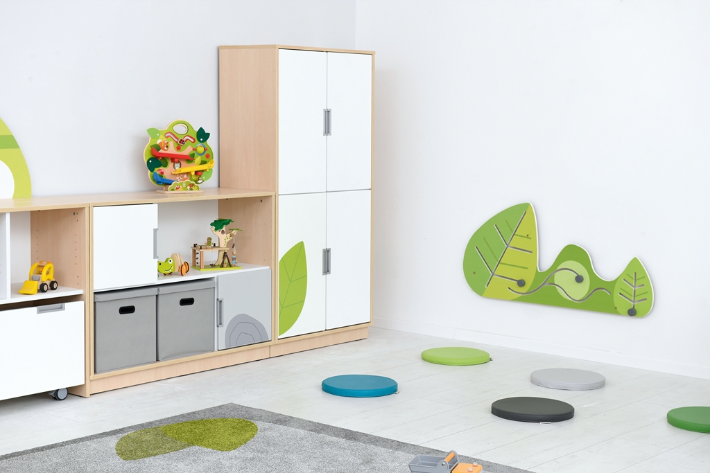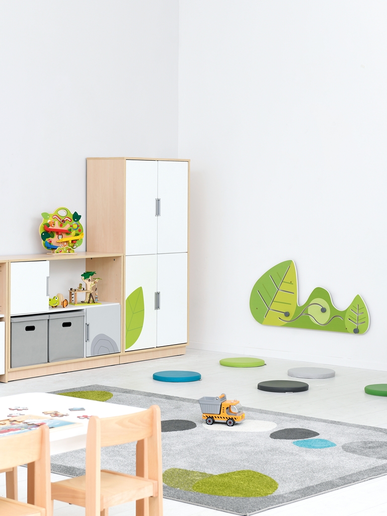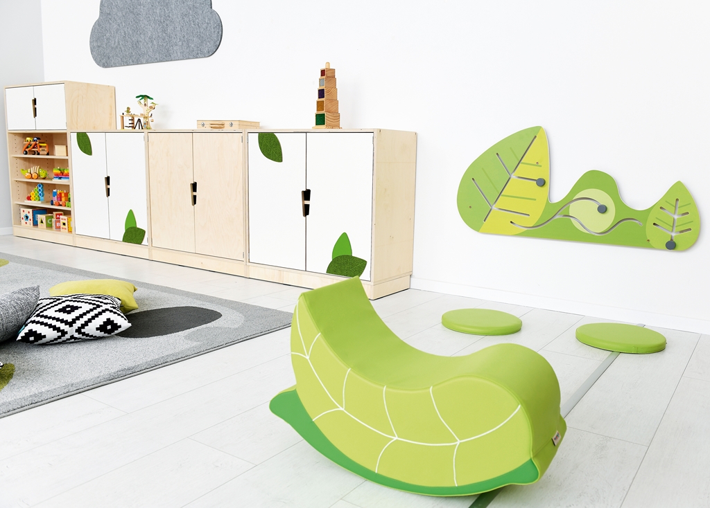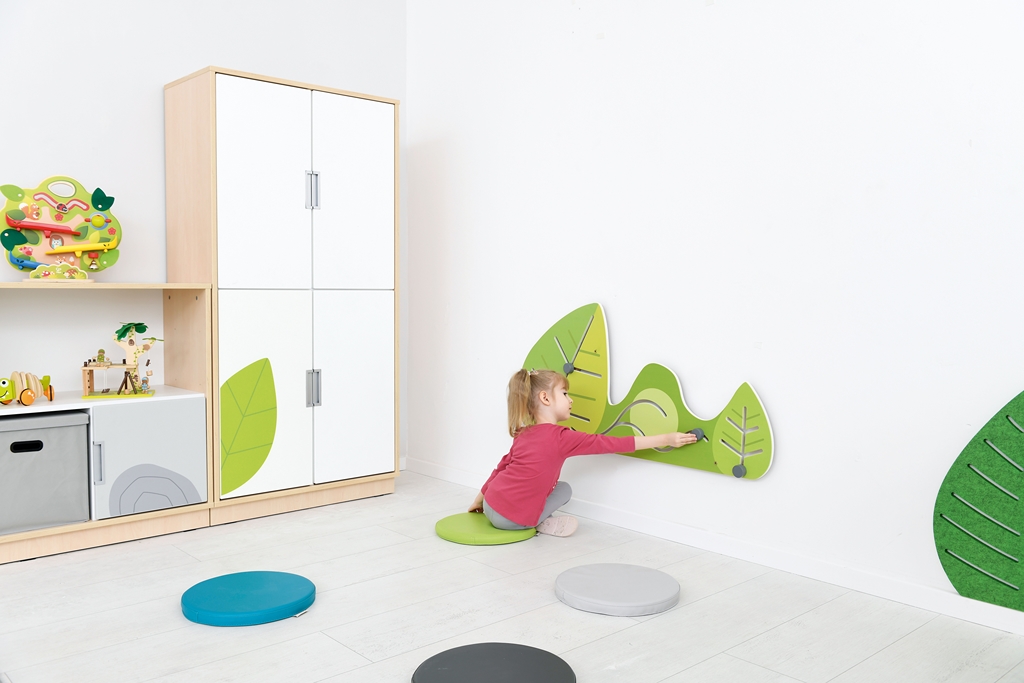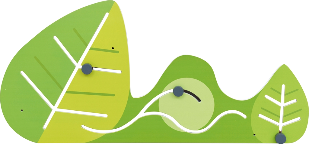 A falra szerelhető zöld leveleket ábrázoló vonalvezető vidám és színes megjelenésével nem csupán a dekorációért felel, hanem készségfejlesztő feladatokat is lehet vele végezni.