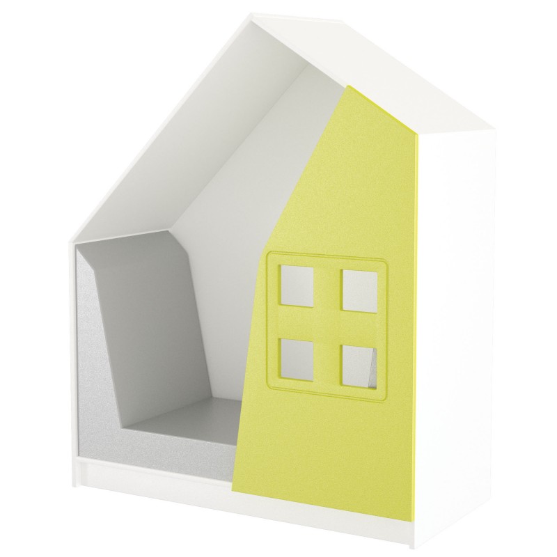 A kuckózós házikó a gyerekek igényeit figyelembe véve lett kialakítva. Kis csúcsos, ház formájú alakja vidám külsőt kölcsönöz neki. A bútor teste fehér színű, takaró - kuckózós - lapja zöld, pici négyszögletes lyukakkal, amik az ablakot szimbolizálják. Belső részébe szürke vagy zöld matrac helyezhető, ezt a csomag nem tartalmazza. A házikó kompatibilis a termékcsalád további bútoraival. A házikó laminált, illetve MDF bútorlapból készült, a tető rétegelt lemez. Mérete: 130x60x173,5 cm
