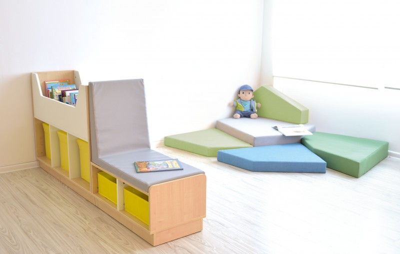 A pihenővel egybekötött polcos térelválasztó 5 db négyszögletes, két oldalról nyitott mélyedéssel lett kialakítva, illetve egy nagyobb tároló polc résszel, melybe könyvek és játékok egyaránt helyezhetőek. Az alján található 5 mélyedés közül 3 nagyobb és 2 kisebb. A bútor két külön elemből áll össze. A tároló polc és a három nagyobb mélyedés az egyik rész, a pihenőelem és a két kissebb mélyedés a másik. A mélyedésekbe külön beszerezhető dobozok tehetőek. A pihenőelem kényelme érdekében egy műbőrrel bevont habszivacs matracon lehet feltöltődni, ülve vagy akár fekve is. A szivacs színe szürke, alakja L betűhöz hasonlít. A bútor lamintált, illetve MDF bútorlapból készült. A lapok színe natúr fa, a polc oldala és a mélyedések elválasztói fehérek. A bútor sarkai lekerekítettek, így is elkerülve a balesetveszélyt. Alján kis taplak találhatóak, így nem karcolja a padlót és stabil alapot biztosít. Tárolópolc: 117x41,5x88 cm. Pihenőelem: 79x41,5x68 cm