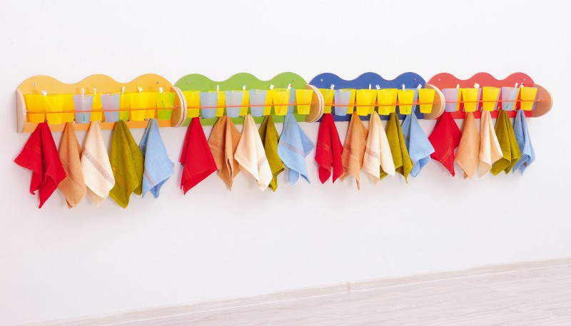Felhőcske formájú fogmosópohár tároló polc és törölköző akasztó kimondottan gyerekek számára lett kialakítva. A polc hátlapja piros színű, felső része hullámvonalban megvágott, Oldalai félkör alakú, natúr fa színű elemek, ehhez csatlakozik a narancssárga műanyag, pohártartó polc, melybe 10 pohár helyezhető. A műanyag polcon kör alakú lyukak vannak, ezekbe helyezhetőek a poharak. Kialakításának köszönhetően stabilan tartja a poharakat, így nem esnek le vagy nem lehet leverni őket. A polc alatt 5 db kétágú fogas található. A termék mérete: 67,5x18x25cm. A pohártartó átmérője: 7cm. Anyaga: MDF bútorlap és műanyag.