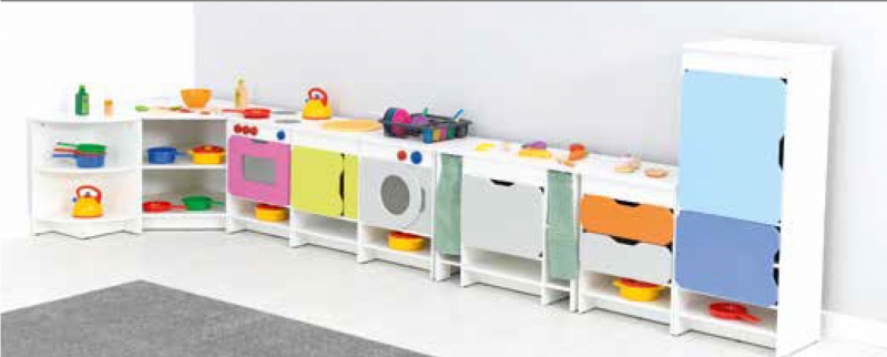2 db sarokelem összeillesztve kiválóan alkalmas végelemnek a színes konyhabútorhoz. Így a termék tér beállítva is jól mutat és sok gyermek tud egyszerre szerepjátékot játszani.