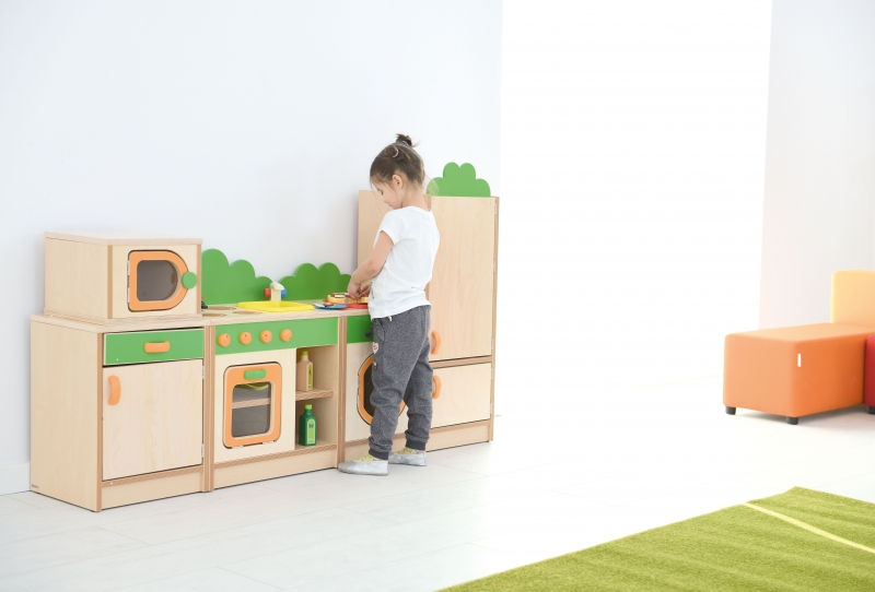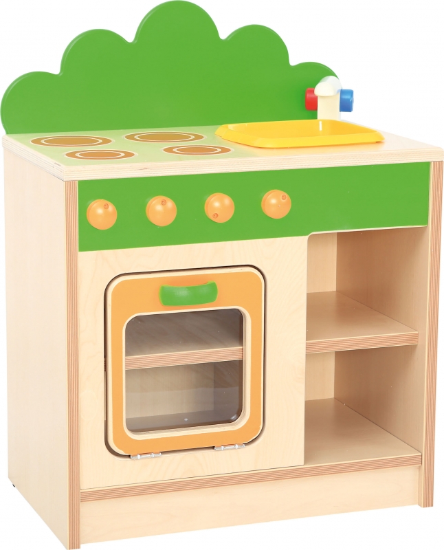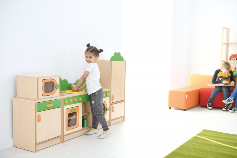 A minikonyha laminált, lakkozott-, rétegelt falemezből és színes MDF lapból készült. Mérete: 53x33,2x68,6 cm. A konyha tetején 4 zónás főzőlap van, alatta sütő, melynek az ajtaja kinyitható.