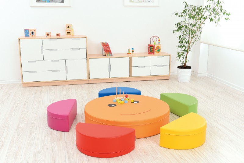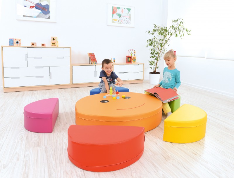 A 6 db-os színes szivacsmodulszett kiválóan alkalmas kisebb létszámú foglalkozásokhoz, illetve beszélgetős-, képeskönyv nézegetős tevékenységhez is. Bármilyen módon összecsukható, tökéletesen szolgál majd asztalként, a félkörök pedig kis ülőkeként.