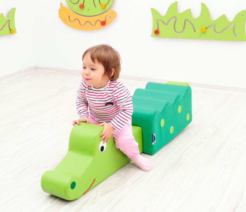 A krokodil pöttyei kitapinthatóak, Könnyedén használható ülőkének is, ha a felső részt leemeljük róla.